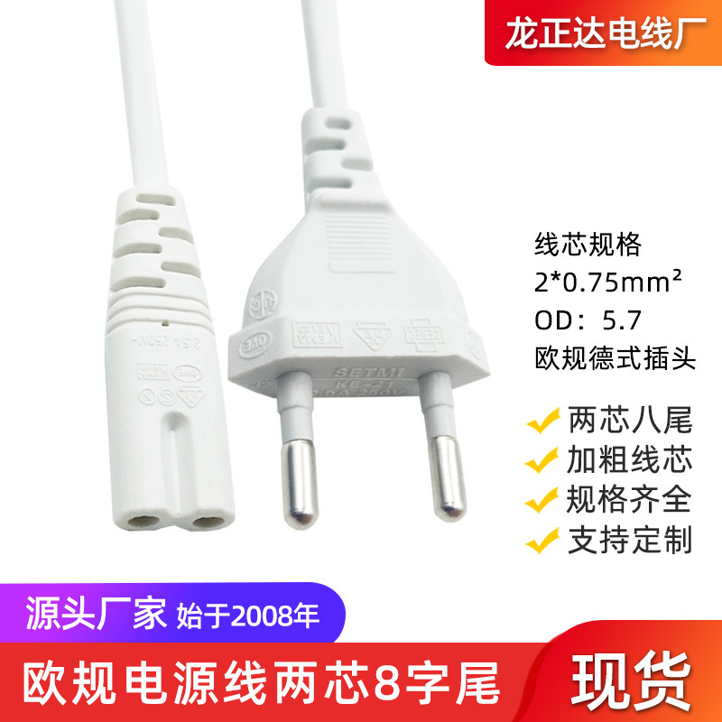 白色欧规插头线 两芯8字尾德式两圆插AC电源线 八尾小欧标电源线